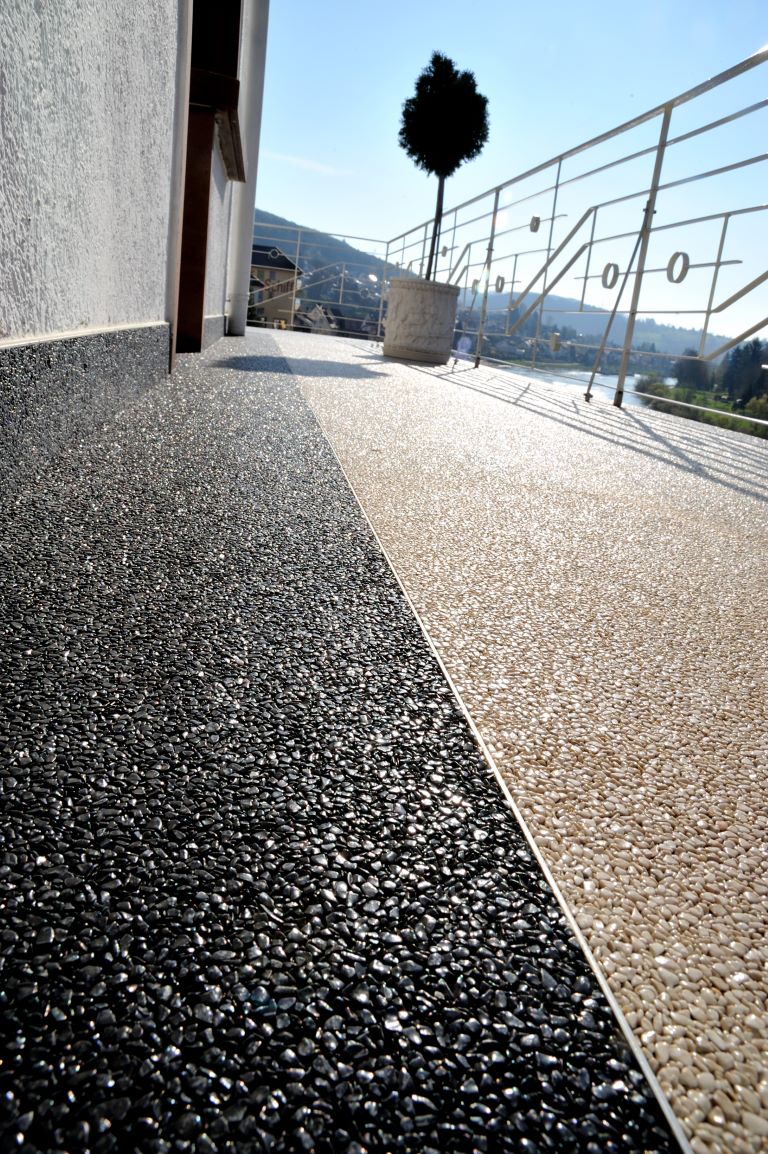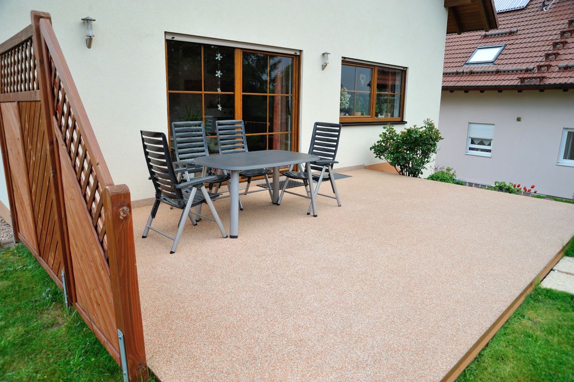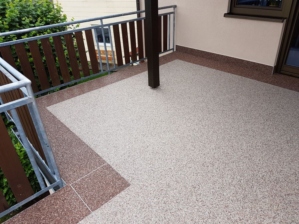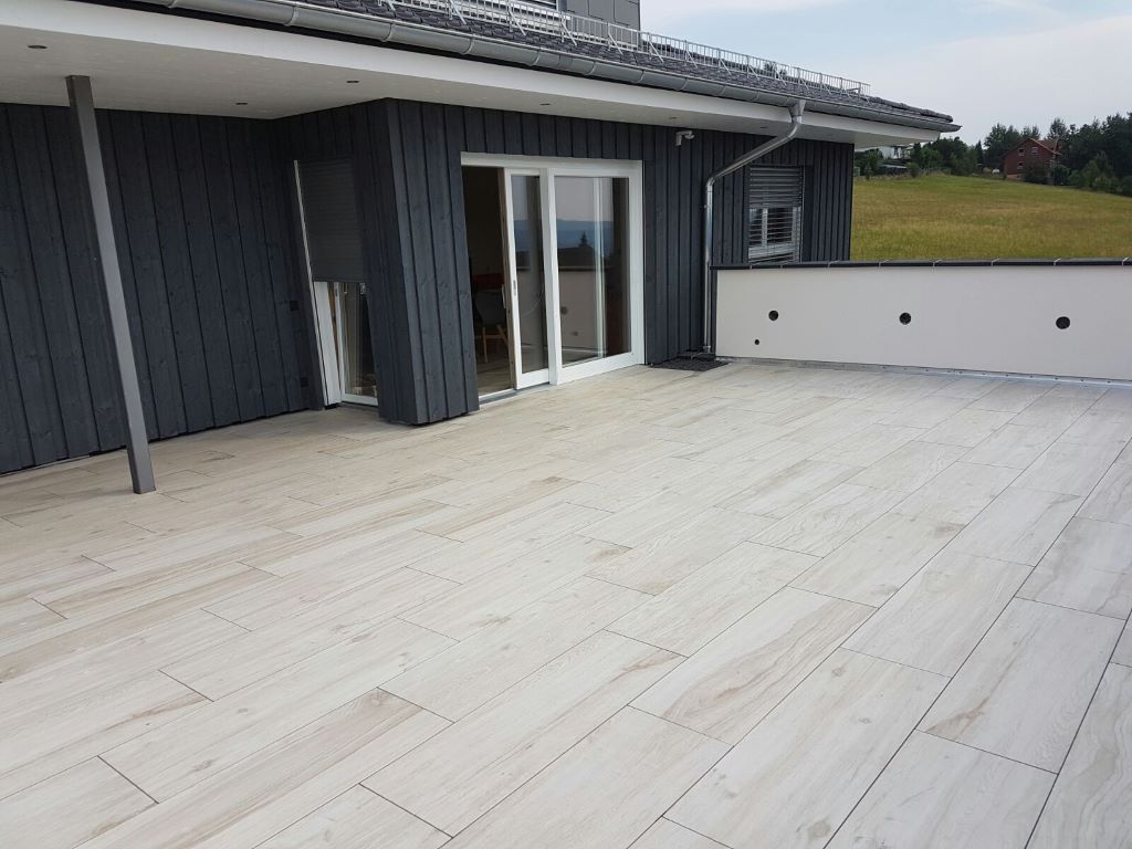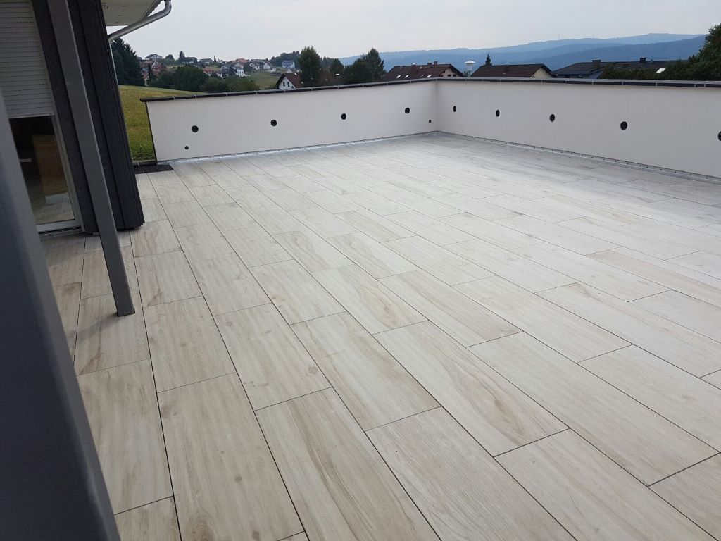 Fliesen, Terrassenplatten, lose Verlegung, Kiesbeschichtung oder Naturstein.