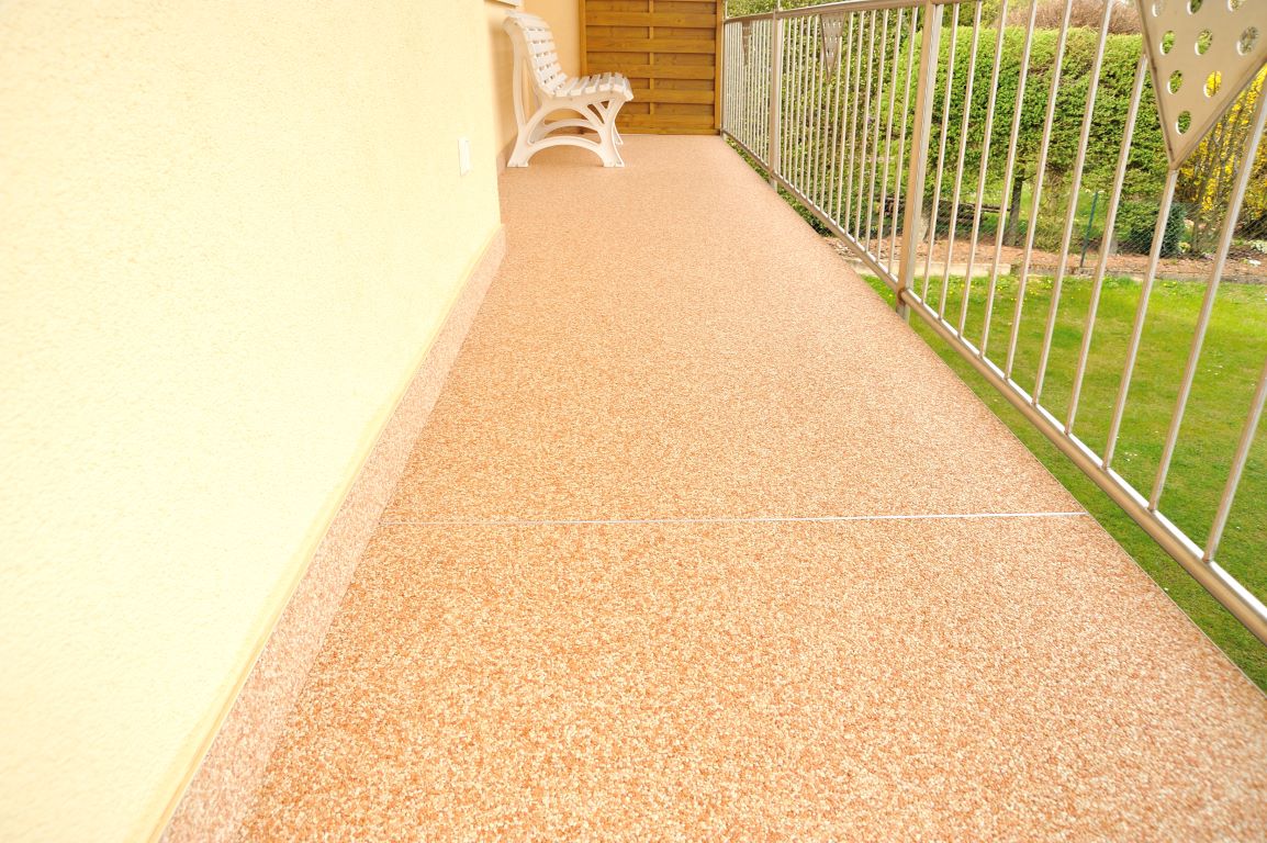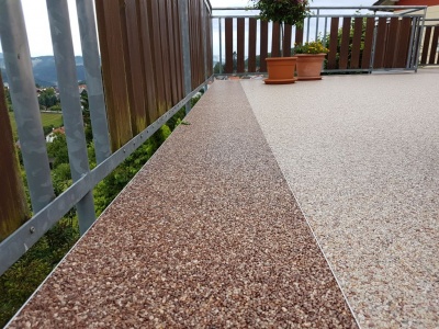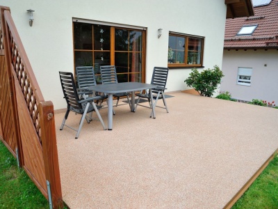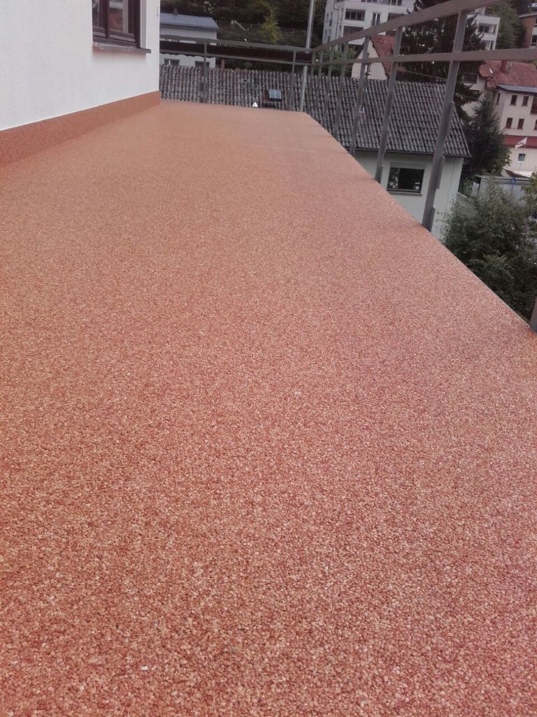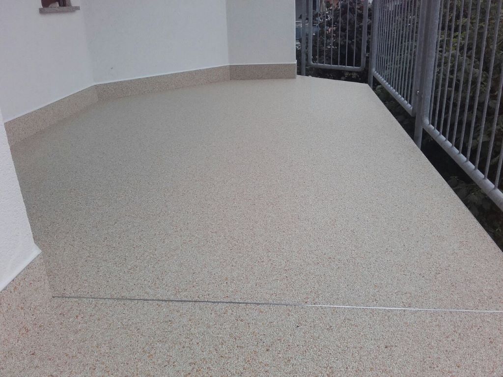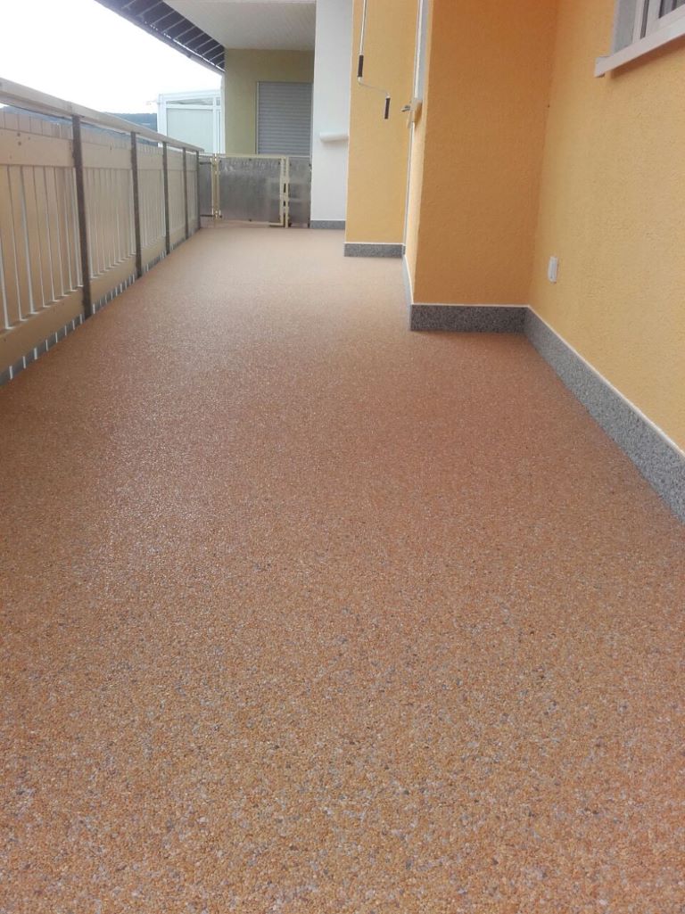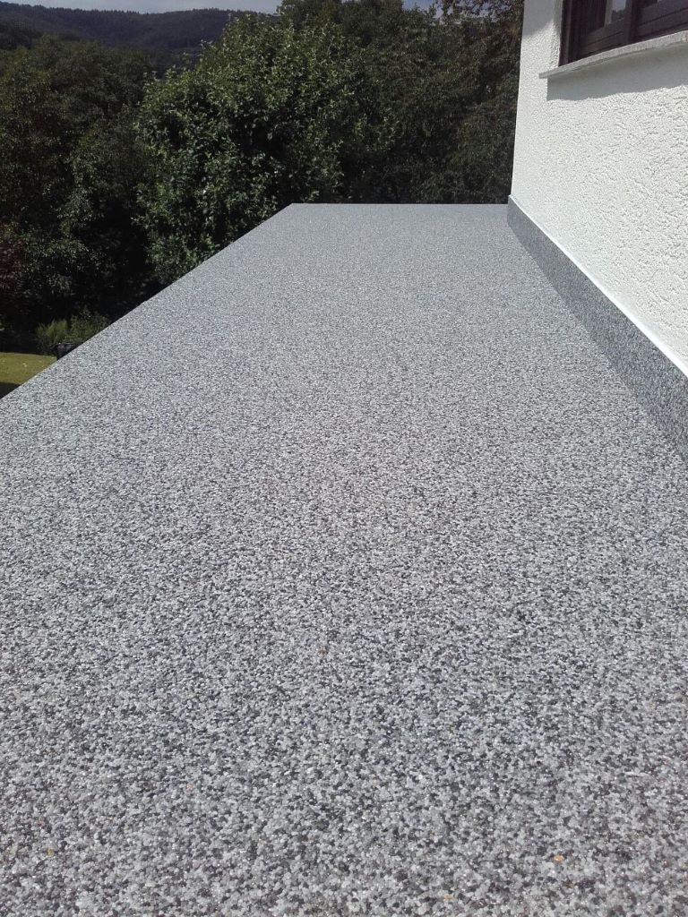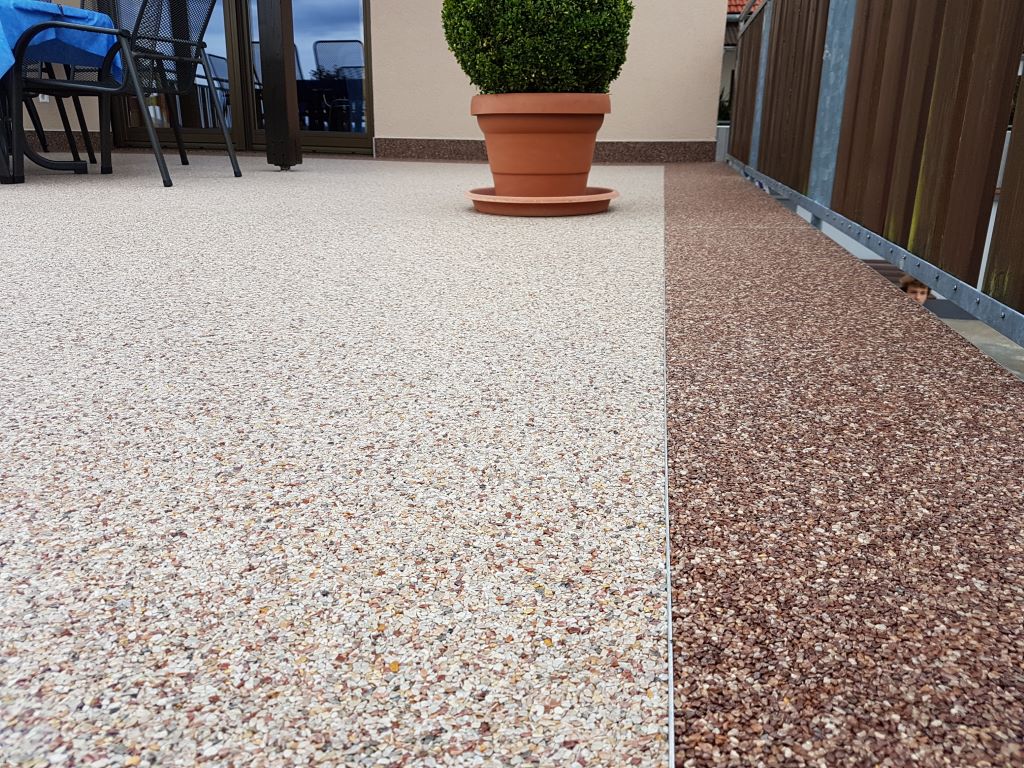 Fliesen, Terrassenplatten, lose Verlegung, Kiesbeschichtung oder Naturstein.