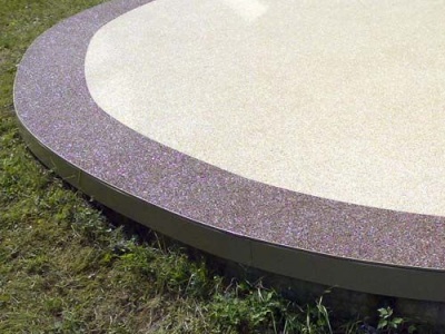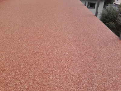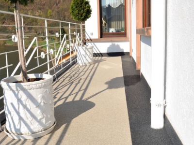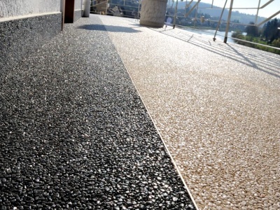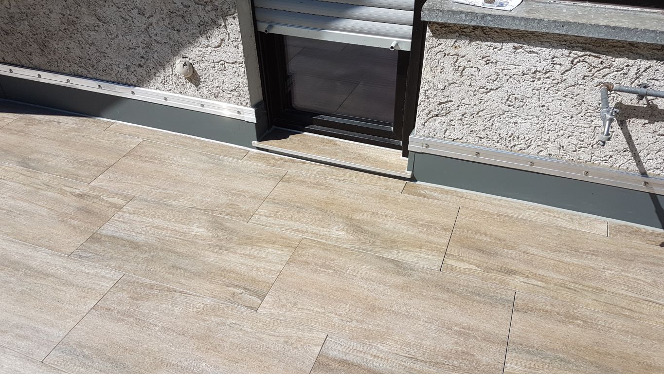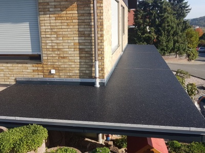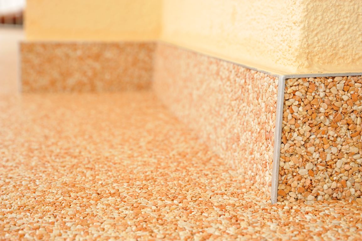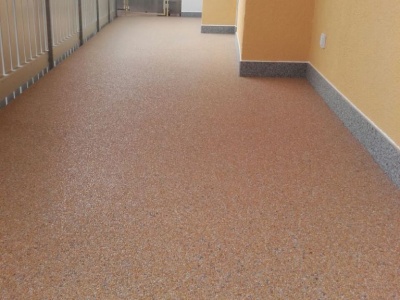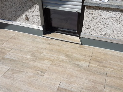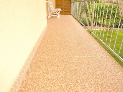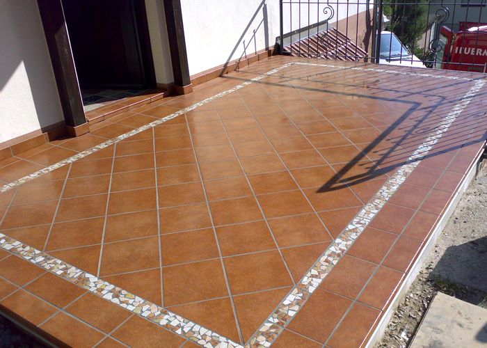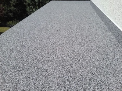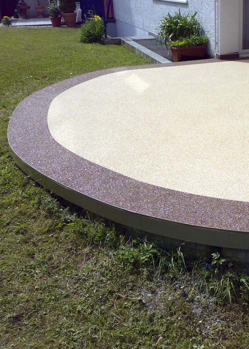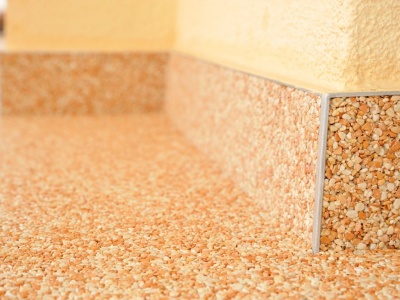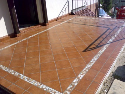 Fliesen, Terrassenplatten, lose Verlegung, Kiesbeschichtung oder Naturstein.
